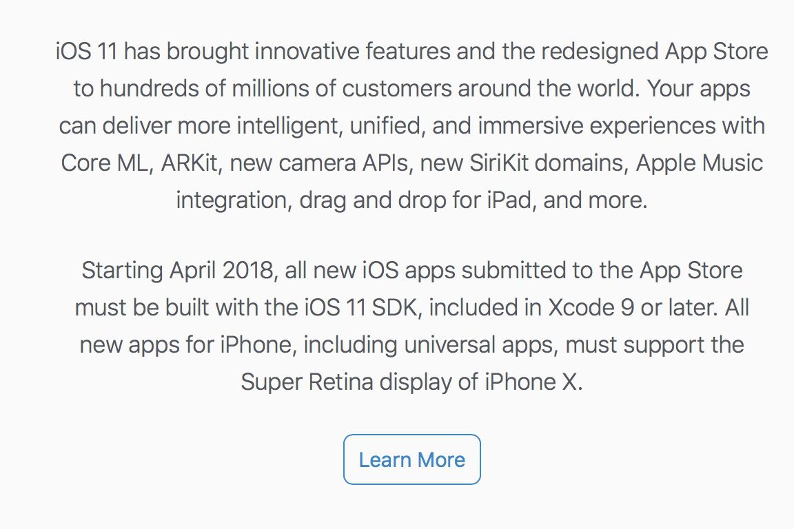 Vývojáře o této nutnosti Apple informoval v odeslaném e-mailu, v němž se také zmiňuje o funkcích, jako jsou Core ML, SiriKit či ARKit a o jejich možné implementaci. Ty však nové aplikace podporovat nemusí, pokud pro ně nemá vývojář využití.