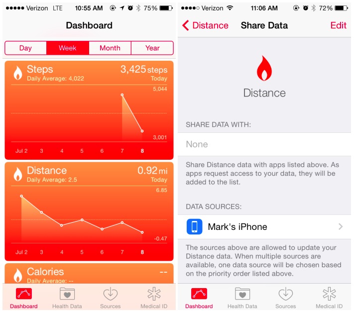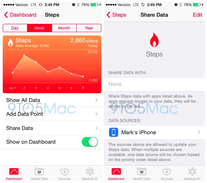 Nejvíce pozoruhodné je, že aplikace Health nyní využívá jako zdroje dat z pohybového koprocesoru M7 iPhonu. Aplikace nyní počítá kroky bez nutnosti připojení k libovolné aplikaci třetích stran nebo hardwarovému zařízení. Tato funkce pravděpodobně využívá koprocesor M7 a aplikace získává data o krocích přímo ze zařízení.