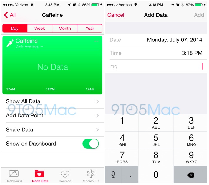 Kromě přidání podpory koprocesoru M7 Apple přidal kofein do dlouhého seznamu nutričních kategorií, které mohou být sledovány aplikací Health. Existuje několik aplikací v App Store, včetně jednoho od Jawbone s názvem Up Coffee, které mohou sledovat a analyzovat příjem kofeinu. Tito vývojáři budou chtít pravděpodobně propojovat své aplikace s databází Health.