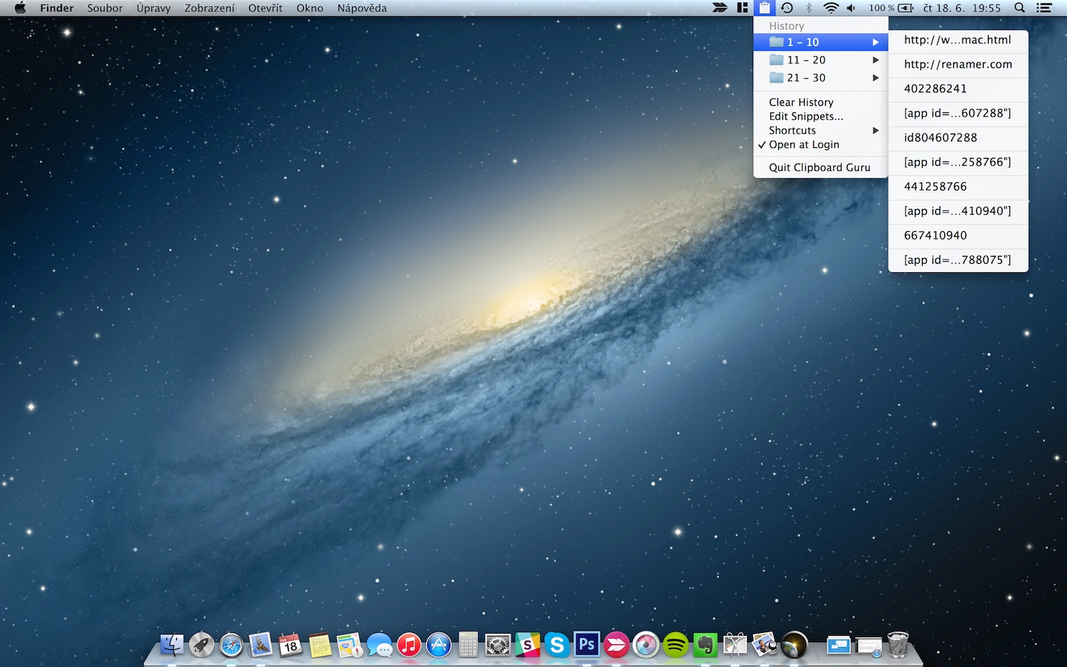 Dalším „must have” programem pro OS X je ClipMenu. Opět se jedná o velice jednoduchý program, který má pro vás k dispozici až 30 schránek pro zkratku „CMD + C”, tedy kopírování obsahu i textu. Pokud často pracujete s textem, je program k nezaplacení a v mém případě ho aktivně používám denně. Za program chtějí autoři symbolických 0,99 dolaru a nabízejí ho v Mac App Storu.