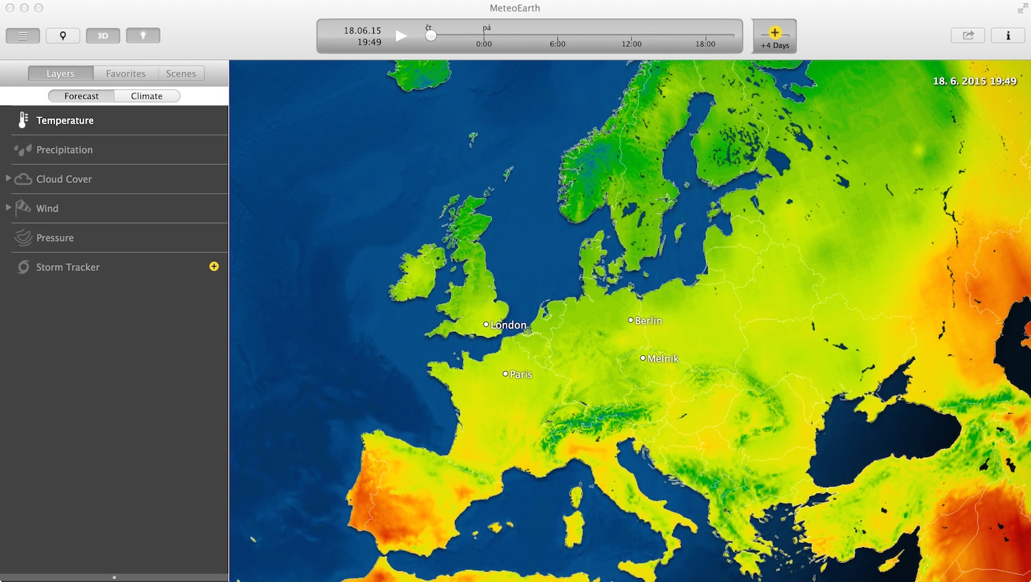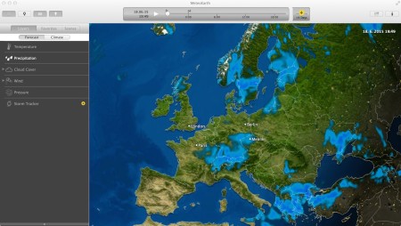 Jedete na dovolenou a potřebujete vědět něco detailnějšího o počasí, a tak se podíváte na iPhone, anebo na weby jako Meteocentrum a spousty jiných. Pro mě je lepší mít stále na dosah kurzoru program MeteoEarth, který se usídlí v horní liště, a stav počasí tak mám neustále k dispozici. Jeho zpracování je perfektní a nabízí pěkné animace srážek, větru, mračen nebo teploty.