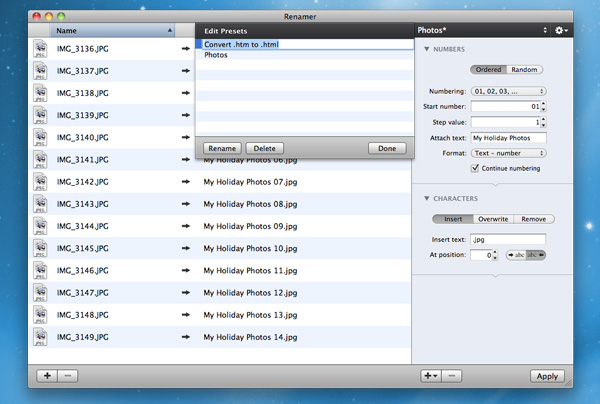 Ať už přejmenováváte statisíce fotografií nebo si rádi organizujete nespočet dokumentů do složek se specifickými nároky na jejch názvy, je program opravdovým pomocníkem. Cena programu se zastavila na 15,99 eura v případě jedné licence. Pokud potřebujete licencí více, lze zakoupit rodinný balík s pěti licencemi za cenu 20,99 eura. Zakoupit ho můžete jak v App Storu, kde je však dražší, tak na oficiálních stránkách.