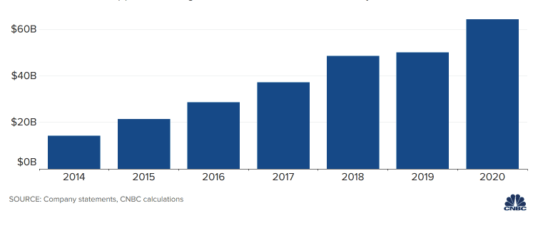 Data založená na analýze provedené CNBC naznačují, že tržby App Store vzrostly během roku 2020 o 28 % a to ve srovnání s mrzkým růstem 3,1 % v roce 2019. V tomto roce pak App Store vydělal údajně 50 miliard dolarů. V roce 2018 to bylo asi 48,5 miliard dolarů. Apple samostatná čísla výdělků App Storu neuveřejňuje, protože tento obchod s aplikacemi zahrnuje do segmentu služeb. Ten za fiskální rok 2020 končící v září vykázal tržby 53,7 miliard dolarů.