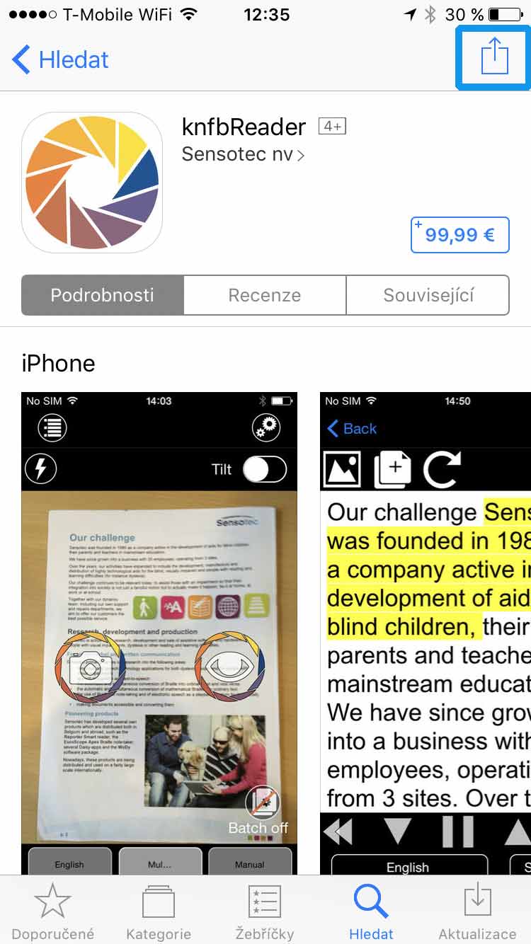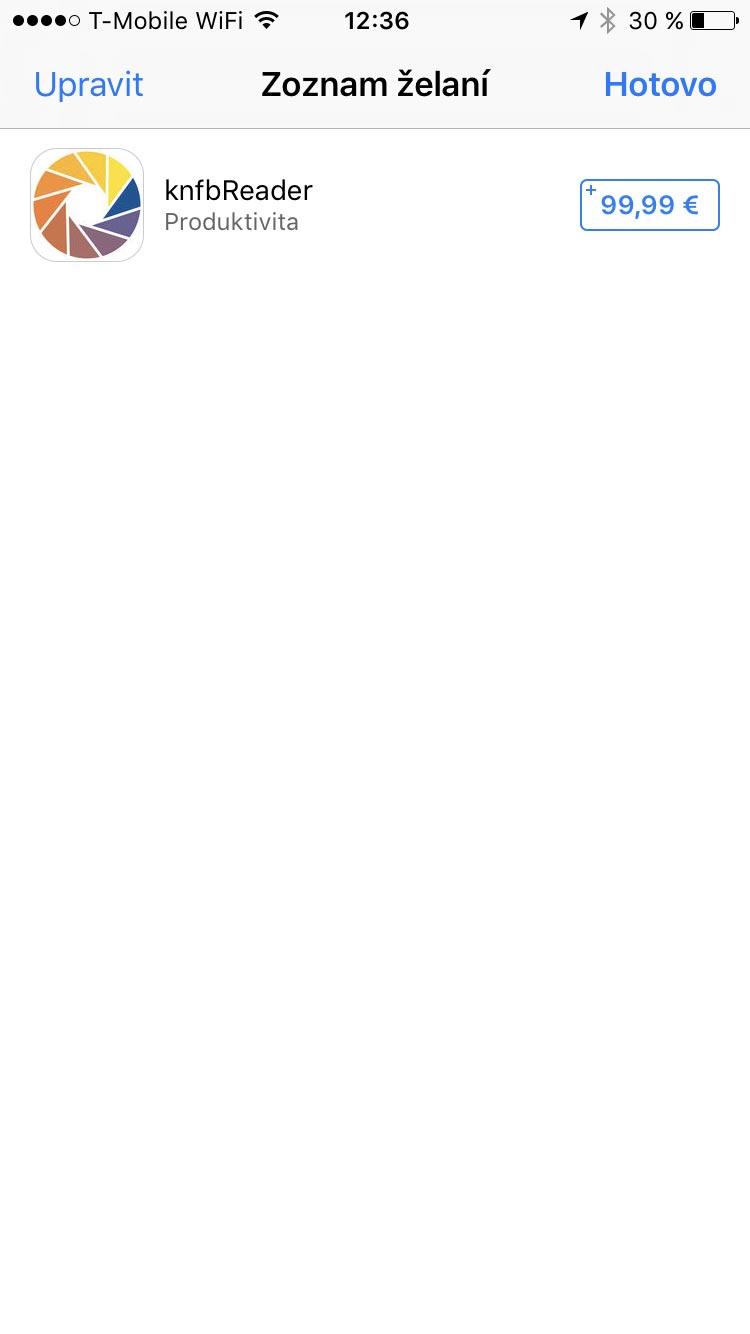 A bylo to. Nyní už jen stačilo průběžně nahlížet do seznamu přání a sledovat, zdali nedošlo ke změně nákupní ceny aplikace. A jednou se mi poštěstilo. V okamžiku, kdy cena klesla na přijatelnější hodnotu, zakoupení KNFB Readeru bylo otázkou pár vteřin.