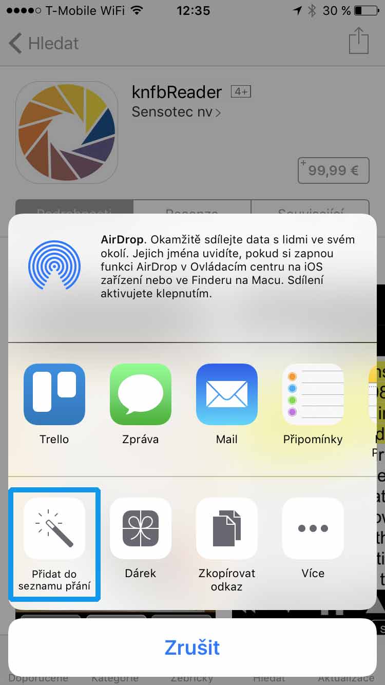 Napadlo mě to takřka okamžitě, i když jsem tuto variantu ještě nikdy nevyužil. Pro hlídání ceny aplikace by se mohl hodit seznam přání, který je nejdostupnější v App Storu z aktualizačního panelu. Pomocí vyhledávání jsem si našel KNFB Reader a rozklikl jeho detaily. Potvrdil možnost sdílet, a celý proces završil stiskem tlačítka přidat do seznamu přání.