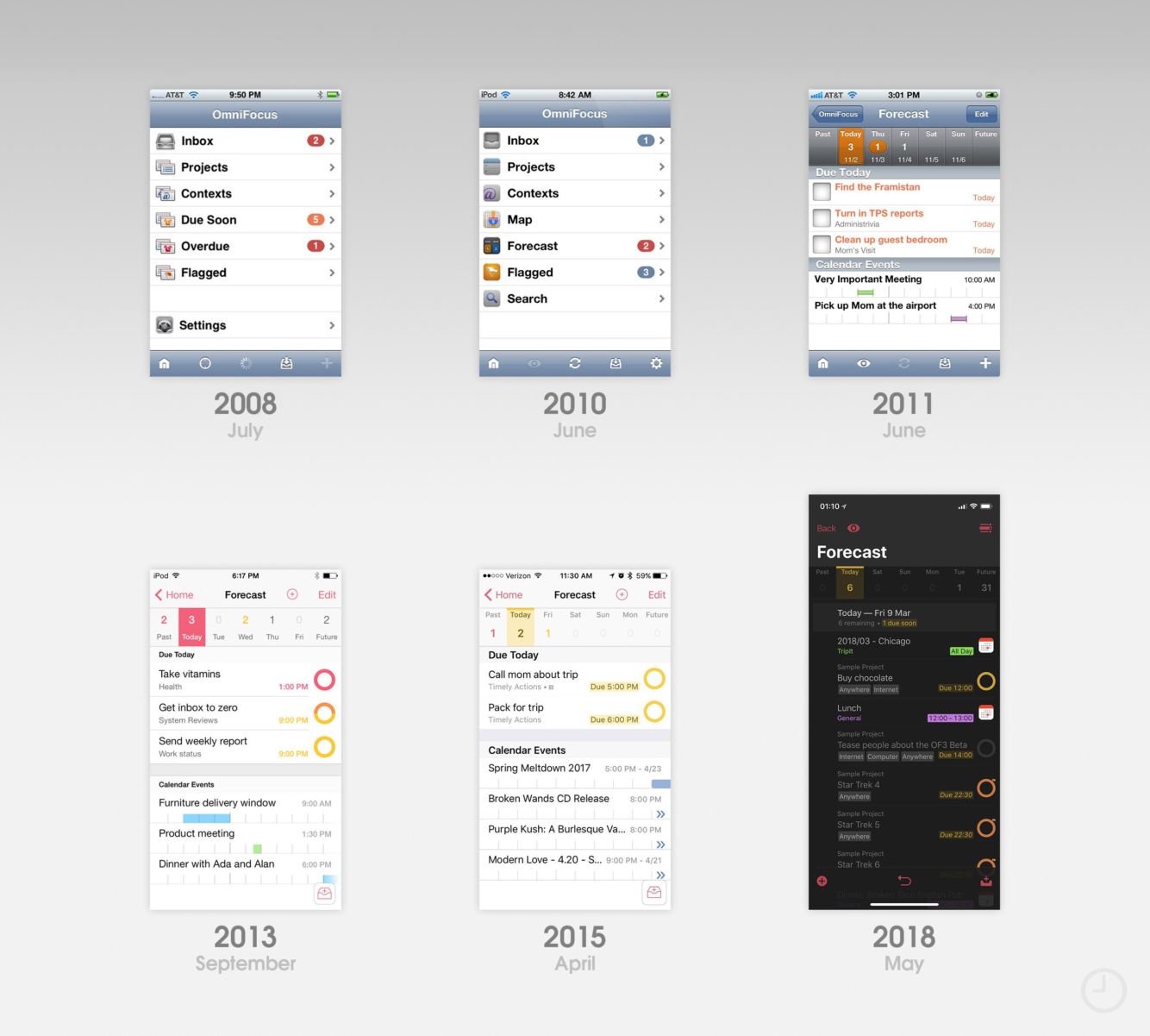 To, že jednou bude iPhone důležitým nástrojem pro práci vycítili i tvůrci aplikace OmniFocus. Oproti titulu Things, který si drží svou původní strukturu dodnes, se OmniFocus z jednoduché tabulky rozrostl do komplexního plánovače. K OmniFocusu ještě jedna zajímavost – hned v roce 2008 získal cenu Apple Design Award. Věřili byste tomu, když se na první otisk obrazovky z aplikace dnes podíváte?