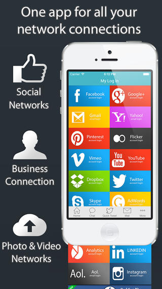 Máte více účtů na sociálních sítích a chcete je spravovat v jedné aplikaci? Aplikace My Log In! je pro vás nejlepší volbou. Podporuje Twitter, Facebook, Linkedin, YouTube, Vimeo, Pinterest, Instagram, Skype, Dropbox, Flickr, Yahoo Mail a účty od společnosti Google jako Google Plus, Google Analytics a Gmail. My Log In! umožňuje používat všechny vaše účty v jedné aplikaci s jednoduchým a snadným rozhraním.