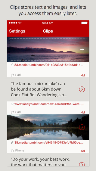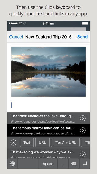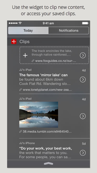 Jednou z velkých novinek iOS 8 je také možnost upravení si notifikačního centra. Přidat si tam můžete spoustu aplikací od počasí až po různé informační texty s obrázky. Právě pro nejdůležitější část textu je vytvořena tato aplikace, kde si vždy vyberete to nejdůležitější, zkopírujete, vložíte a dáte si odkaz na celý článek. Velice se tak může hodit i do školy, pokud při hodině nevíte, tak se pouze rychlé podíváte.