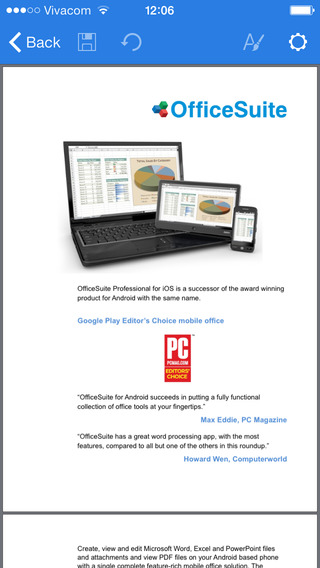 Pomocí OfficeSuite Pro zobrazujete, upravujete a vytváříte soubory Word, Excel a PowerPoint na vašem iPhonu nebo iPadu. Aplikace také podporuje otevírání souborů PDF. V OfficeSuite Pro ukládáte dokumenty do vašeho cloud úložiště (iCloud, Google Drive, Dropbox, OneDrive atd.), sdílíte dokumenty prostřednictvím e-mailu a jednoduše dokumenty tisknete.