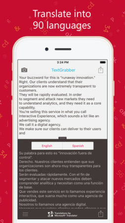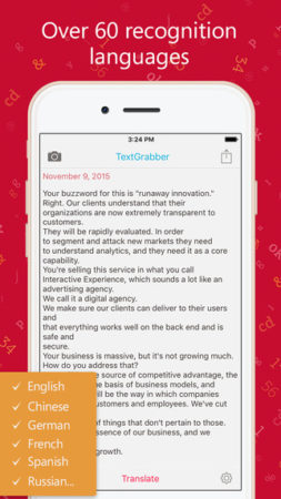 Aplikace TextGrabber slouží k převodu tištěného textu na elektronickou formu. Má na výběr z více než 40 jazyků, a získala již několik ocenění za nejlepší aplikaci. Aplikací lze fotit krátké články, ale i celé listy papíru. Rozpoznání je rychlé a efektivní.