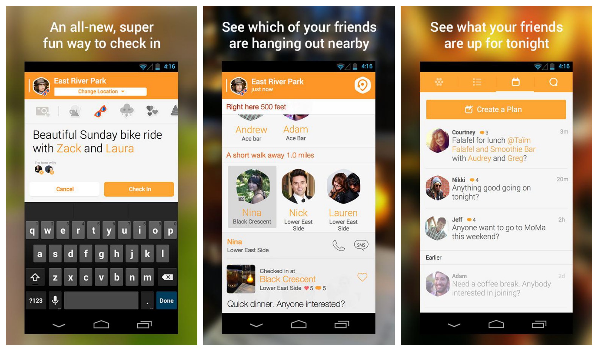 Tato novinka pochází od tvůrců populárního Foursquare. S touto aplikací ihned zjistíte, kdo z vašich přátel se nachází ve vašem okolí. Je zde možnost klasického check-in a možnost poslat fotku zajímavého místa přátelům na Foursquare. Obě aplikace jsou úzce propojené a vzájemně se doplňují. Aplikace je ke stažení zdarma.