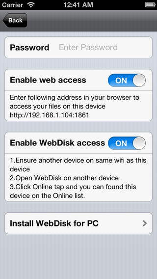 WebDisk+ podporuje nahrávání a stahování souborů (o velikosti větší než 4 GB), využijete ho na posílání souborů mezi počítači nebo mobilními zařízeními. Aplikace umí soubory i přímo zobrazovat – od souborů txt, přes dokumenty Office až po PDF. K dispozici je i verze pro počítač, která vám umožní snadné prohlížení dokumentu či jeho samotné stažení.