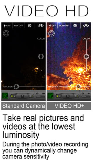 Video HD+ vám pomůže natáčet videa vašich snů. Pomocí této aplikace můžete měnit barvu, citlivost, jas, posun z černé a bílé atd. S aplikací můžete snímat ve tmě bez zapnutí blesku! Během foto/video nahrávání lze dynamicky měnit citlivost fotoaparátu pro dosažení nejlepšího výsledku, stejně jako nastavit libovolný zoom. Aplikace má vlastní knihovnu na uspořádání fotografií a videa a umožňuje je sdílet na Facebooku, Dropboxu a Twitteru.