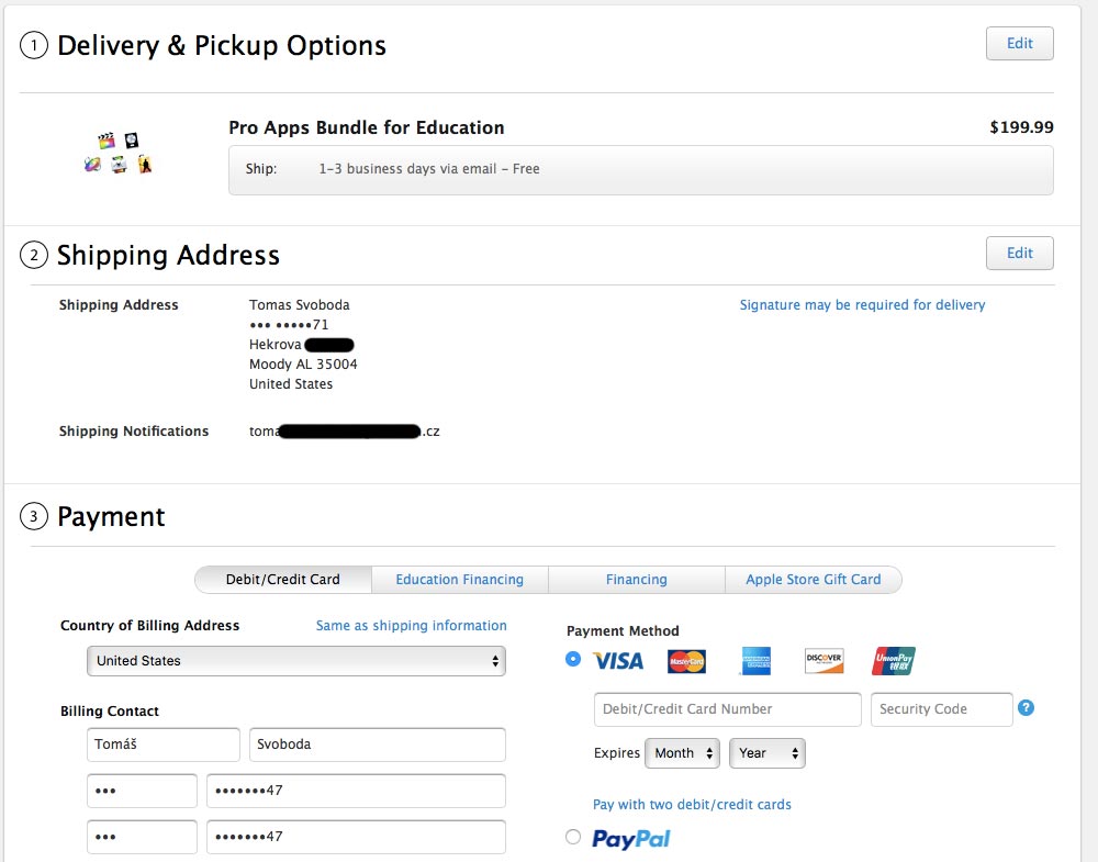 Po vložení balíčku do tašky se přihlásíte se svým Apple ID (pokud ještě nejste) a pokračujete stejně, jako když něco kupujete na českém Apple Online Storu. Změna přichází až v momentě, kdy zadáváte adresu doručení. Ta nesmí být česká. Doporučuji si tedy najít poštovní směrovací čísla (ZIP code) amerických států a telefonní čísla ve správném formátu s odpovídající předvolbou. Ostatní údaje můžete použít svoje a systém vás pustí ke kroku zaplacení. Hlavně ale zadejte správný email!