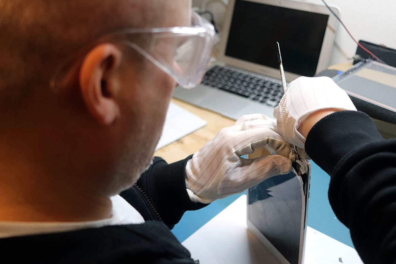 Na pražský Smíchov jsem dorazil odpoledne a zařízení odevzdal do rukou techniků. Sledoval jsem celou dobu, co se s mým iPadem děje a jak oprava postupuje. Nejdříve se tak provedlo nahřátí prasklého skla, aby šlo lépe sundat. Dlátkem se odstranilo společně se zbytky lepidla. Technik prohlédl i vnitřek iPadu, aby mohl vyloučit případné další poškození.