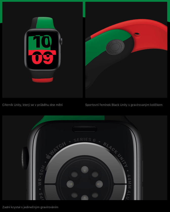 Hodinky mají svůj zadní krystal obohacený o jedinečné gravírování, sportovní řemínek Black Unity pak má gravírovaný kolík. Součástí hodinek je ale i ciferník Unity, který se v průběhu dne mění. Ten je však také součástí nového watchOS 7.3, tak jej mohou používat všichni majitelé Apple Watch s nejnovějším systémem, anebo si jej můžete stáhnout přímo na stránkách Applu. Zde toho ale najdete o poznání více.