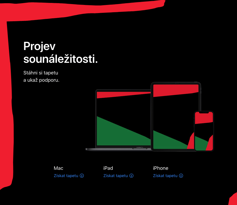 Pokud totiž najedete na stránku Watch a rozkliknete si u novinky nabídku Více, níže najdete možnost projevit svou sounáležitost sažením si tapety. Ta je k dispozici pro počítače Mac, tablety iPad a samozřejmě i telefony iPhone a to zcela zdarma. Rozlišení pro Mac pokrývá např. i 16“ MacBook Pro a to pro iPhone samozřejmě i nejnovější 12 Pro Max.
