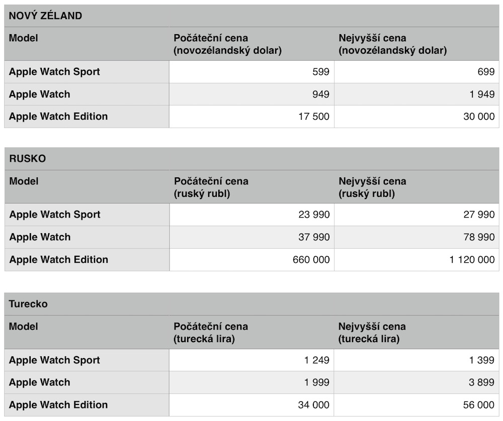 Níže jsou uvedené ceny Apple Watch v jednotlivých státech.