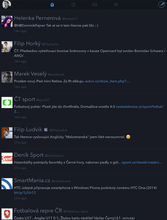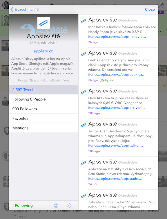 Pokud používáte Twitter, a my doufáme, že ano a sledujete naše @Appliště a @Appsleviště účty, tak jistě na iOS využíváte nějakou tu Twitter aplikaci. Můžete používat aplikaci přímo od Twitteru nebo nějakého Twitter klienta, který nabídne spoustu funkcí navíc. Nejznámější a také nejoblíbenější je bezesporu Tweetbot. V minulosti jsme o něm zde též psali. Tento týden přišel s novou strategií prodeje v App Storu klient Twitterrific, který si své uživatele sice našel, ale aby rozšířil svojí základnu o dalších pár desítek a možná i stovek tisíc uživatelů, uvolnil aplikaci zcela zdarma a napořád. Samozřejmě je to něco za něco. Klient je zdarma, ale má mnoho omezení. Především vám bude vadit reklama na timeline, postrádat budete notifikace, denní přehled a rychlé překlady tweetů z cizích jazyků. Toto vše si můžete odemknout pomocí In-App nákupu vně aplikace. Aplikaci doporučujeme zvlášť, pokud si chcete uzpůsobit timeline, například velikostí písma, řádkováním, náhledy fotek nebo si rádi Twitter klient zapínáte před spaním a oslní vás vždy bílé pozadí. V tomto Twitterrific nabízí mnoho uzpůsobení a noční režim. Vyzkoušejte a sami se rozhodněte, který Twitter klient vám padl do oka nejvíce a ten také používejte.