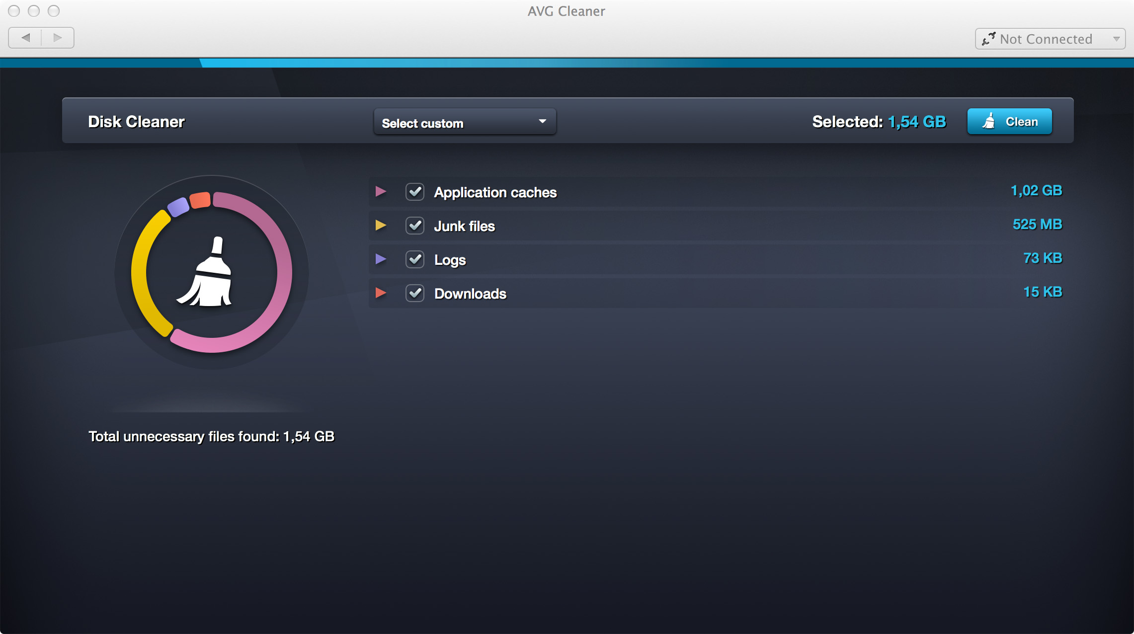 Po kliknutí na tlačítko Scan Mac začne program automaticky vyhledávat dočasná nebo zbytečná data, jako je cache vyhledávačů, cache iPhoto, logy, historii stažených souborů, pozůstatky složek po aplikacích, které již byly odinstalovány, a v naposlední řadě také vysypání koše. Po zobrazení výsledků vám program graficky a přehledně zobrazí všechna data, která lze bez ostychu odstranit. Pomocí zatrhávacích tlačítek už jen zvolíte, co se má nebo nemá odstranit. Je dobré si dát pozor na položku Downloads, kdy vám AVG Cleaner odstraní, pokud mu to dovolíte, všechny soubory ze složky pro stahování.