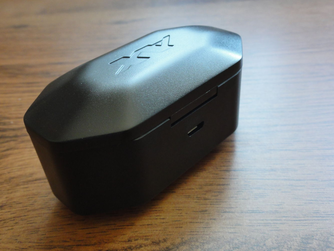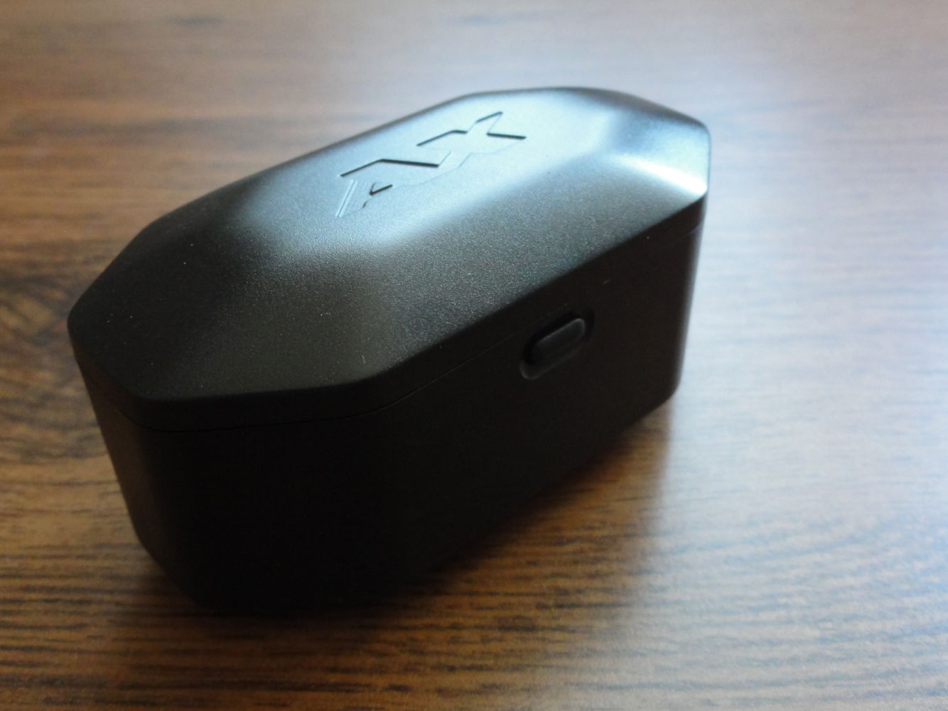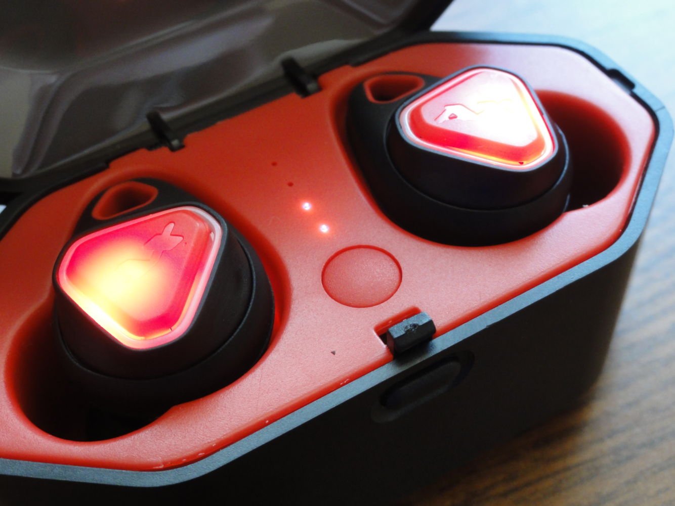 Samotné pouzdro má pak jedno tlačítko a nad ním řadu čtyř diod. Po jeho stisknutí se ty rozsvítí, čímž zjistíte, jak je samotné pouzdro nabito. To sluchátkům předává potřebnou šťávu pomocí obsažených pin konektorů. Na každém sluchátku jsou dva a zásadní nevýhoda je v tom, že jakmile je neustavíte přesně, sluchátka se nabíjet nebudou. Stává se to sice ojediněle, ale přece.