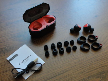 Axum Gear jsou usazené do docela rozměrné krabičky, která je uvnitř vystlaná molitanem. V něm jsou uchycena jak samotná sluchátka, tak jejich nabíjecí pouzdro. Po jejich vyndání pod nimi najdete ještě potřebné dokumenty, nabíjecí microUSB kabel a neskutečné množství různých nástavců.