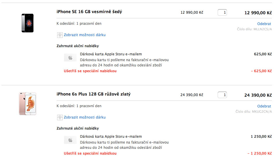 U iPhonu SE ušetříte skoro tisícovku. Nejvyšší varianta iPhonu 6s Plus s 128GB úložištěm je pak levnější o více než 1 700 Kč. Bohužel, na iPhone 7 se slevy nevztahují. Se slevou můžete dnes koupit jediný kus Macu, iPhonu, iPadu, iPodu nebo Apple Watch a produkty musí být skladem.
