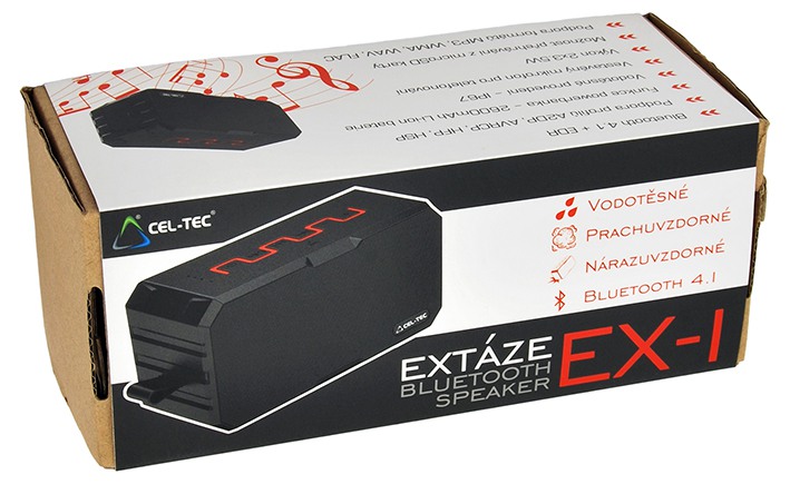 Balení produktu příliš neplýtvá ani místem, ani materiálem. Kartónová krabička je přetažena jen lesklým papírem s vyobrazením produktu a jeho vlastnostmi. Uvnitř, vyjma samotného reproduktoru CEL-TEC Extáze EX-1, naleznete nabíjecí kabel microUSB, audio kabel s 3,5mm jack konektorem pro připojení jakéhokoli zařízení s touto koncovkou, karabinu, a samozřejmě návody k použití, mezi kterými nechybí ani ten český.