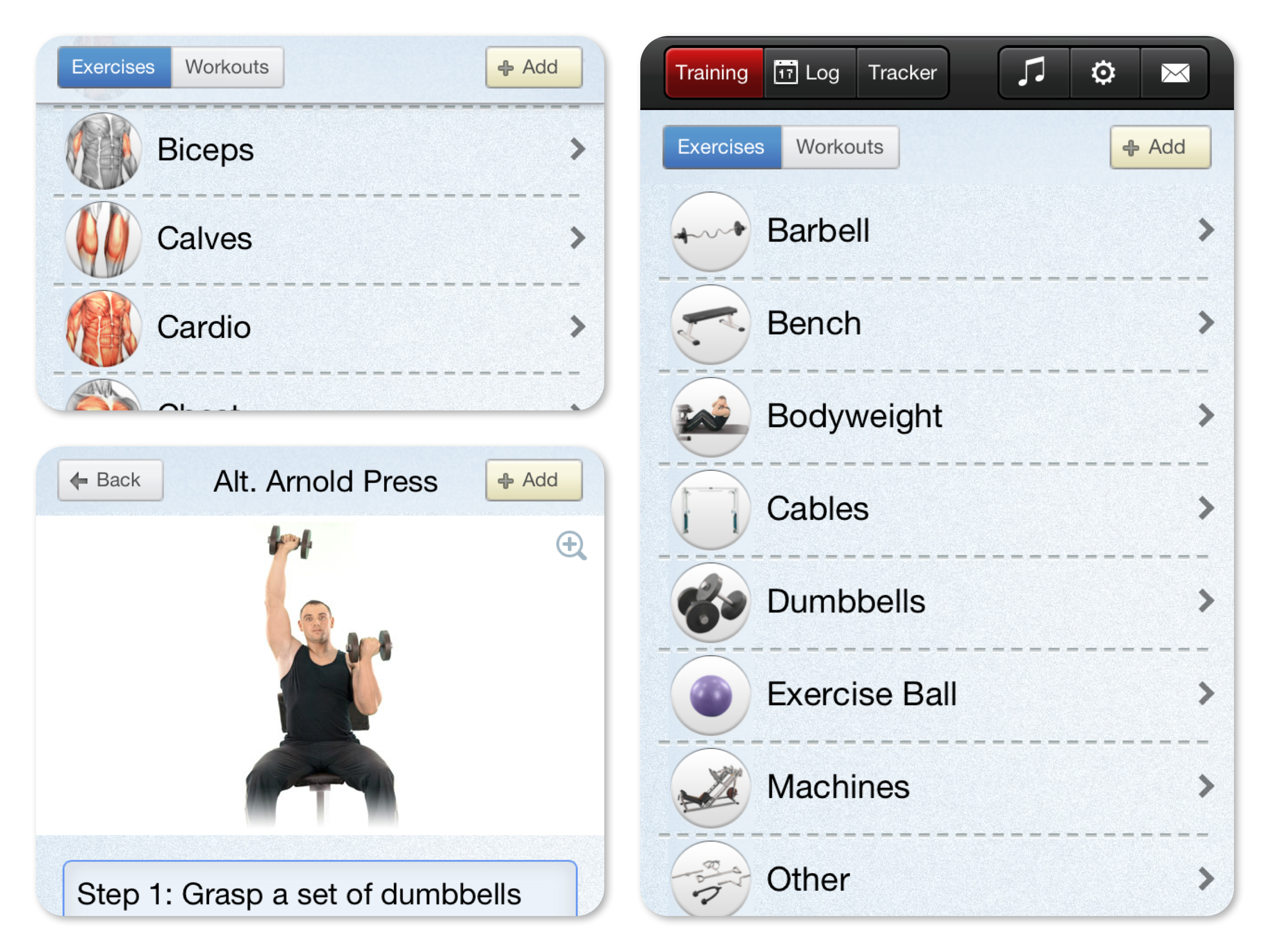 Pokud chcete mít vaše tělo pružné a aby vám svaly pěkně rostly, bude zapotřebí nějaké to anaerobní cvičení. Aplikaci FitnessTrainer využívám vždy, když potřebuji předvést nějaký nový cvik, nebo si nejsem jistý správnou technikou určitého cviku. FitnessTrainer můžete využívat naprosto jednoduše – na výběr máte z pěti základních seznamů: Všechny cviky, svalové partie, části těla, cviky podle vybavení a vámi vytvořené cviky.