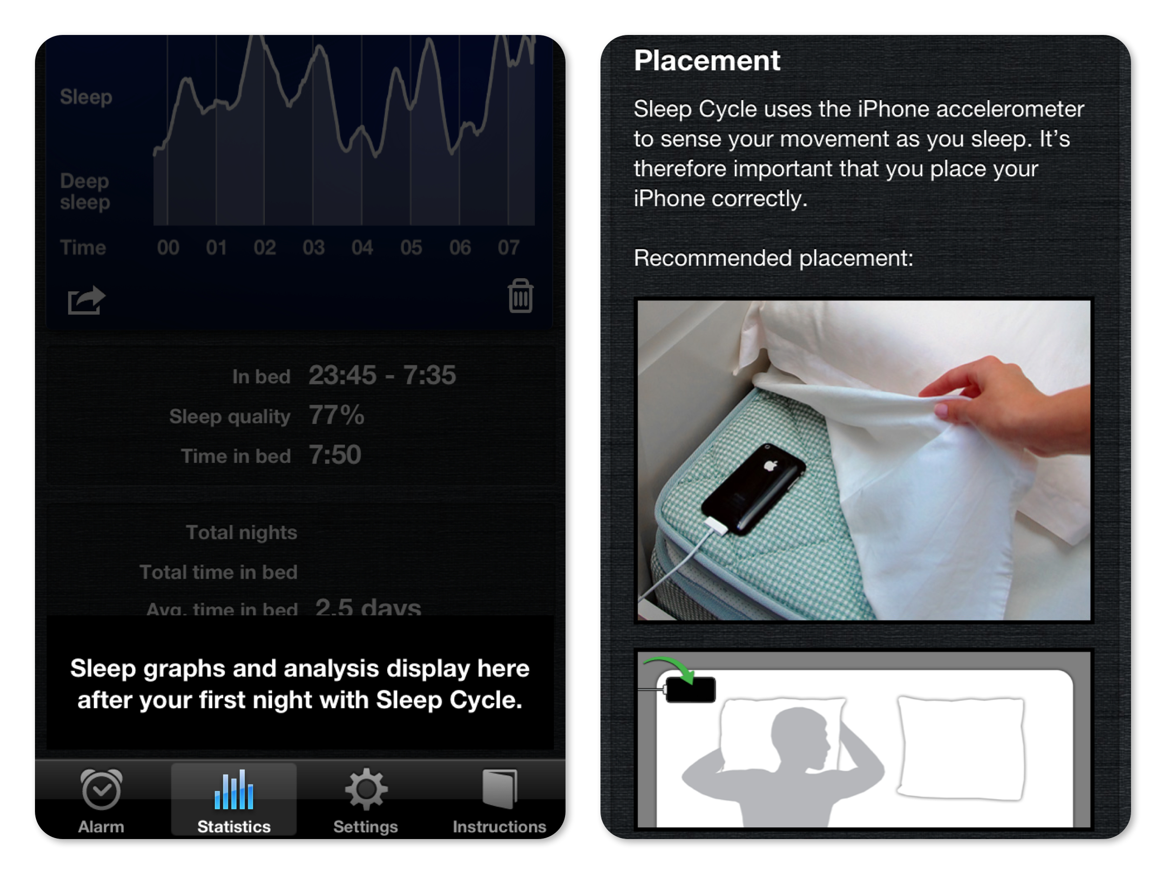Se spánkem jsem měl vždycky problémy. Už od střední školy usínám pozdě v noci a mám posunutý celý režim. Na doporučení jsem si stáhl aplikaci Sleep Cycle. Tato chytrá aplikaci monitoruje váš spánek během noci. Nevýhodou je, že iPhone musíte mít celou noc odemčený, napojený do elektrické sítě a položený na kraji postele pod polštářem. Pomocí gyroskopu zaznamenává vaše pohyby a tím dokáže rozpoznat, kdy ještě pořádně nespíte a kdy už jste upadli do hlubokého spánku. Podle pohybů také zjistí, když se začnete pomalu probouzet a vzbudí vás v tu nejlepší dobu a měli byste se cítit co nejvíce odpočati. Příjemné je nastavení vlastního tónu budíku. Vstává se mi mnohem lépe, když slyším cvrlikání namísto mého standardního vyzvánění „alarm“.
