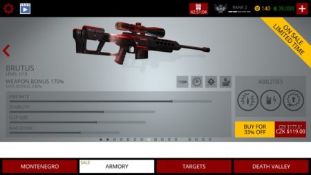 I když je hra za poplatek, čekají v ní na vás mikrotransakce. Ty se točí hlavně kolem nových kvérů. Odstřelovacích pušek je k dispozici docela dost, ale hraním si je odblokujete až za notný čas. Chcete-li tedy lepší pušku, musíte pustit nějakou tu korunu. Každá zbraň má jiné vlastnosti, s každou se střílí trochu jinak. K dispozici máte i různé schopnosti, kdy zadržíte dech, čímž zamezíte chvění atd.