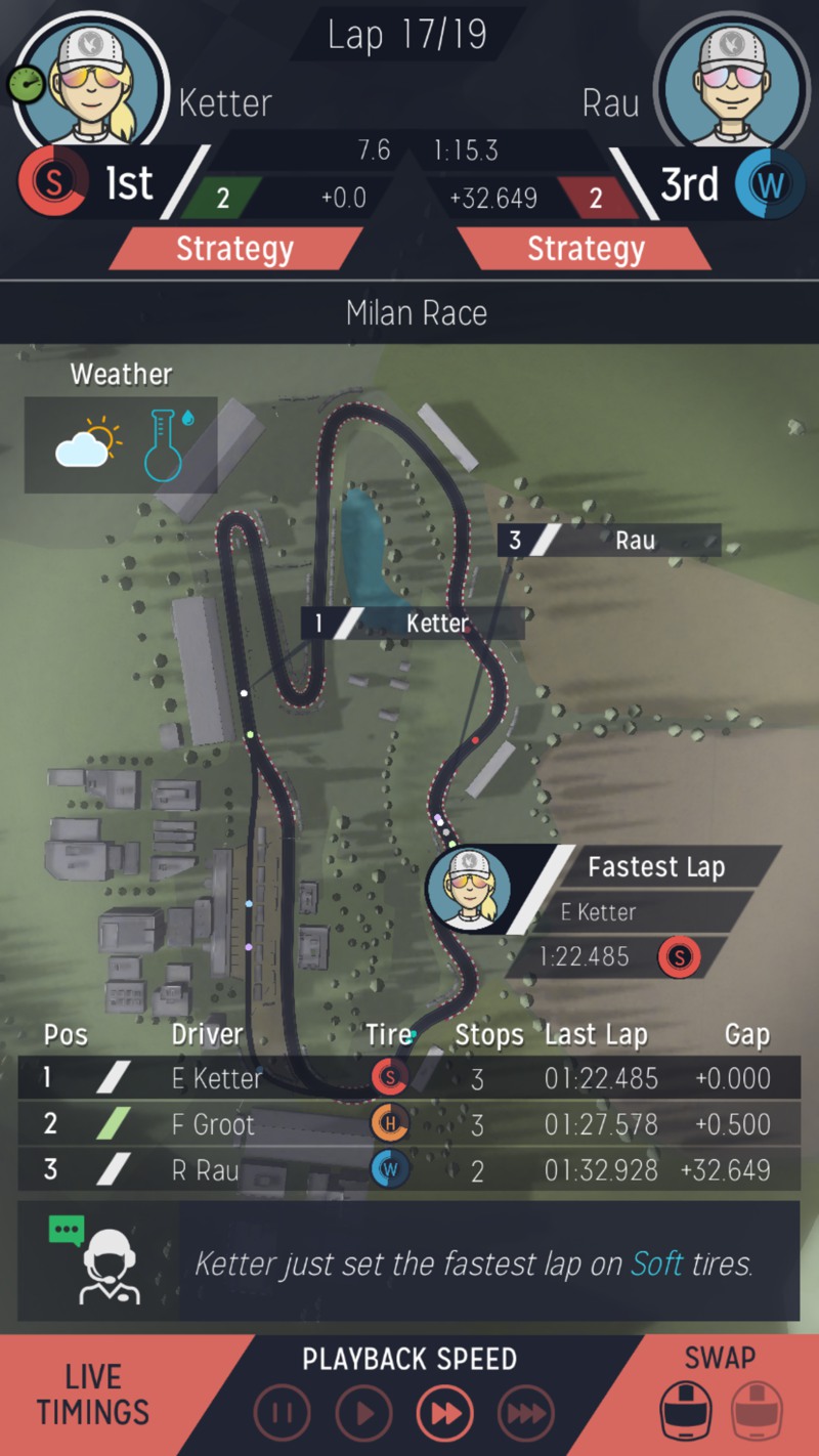 Vyjma pneumatik už je na vás jediné rozhodnutí – zda má závodník tlačit na pilu a upalovat kupředu nehledě na riziko, či zda má jet konzervativně a šetřit gumy. A protože máte na trati dva své svěřence, budete mít sakra co dělat vše uhlídat.