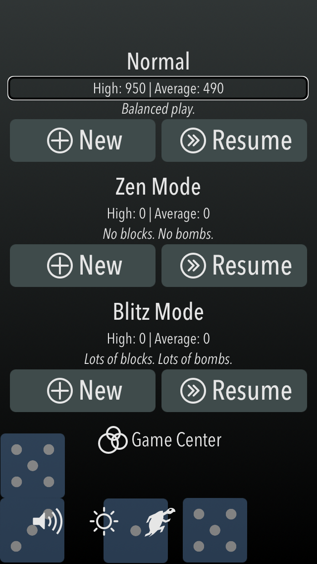 Diced nabízí tři různé módy hry. Buďto můžete hrát normální hru, kde máte k dispozici tři bomby a blok na vás čeká až po deseti tazích bez vytvoření kombinace. Zen je mód bez bomb a bloků. Prostě taková nenásilná meditační záležitost. Jejím naprostým opakem je Blitz. Tady na vás čeká deset bomb, ale hra vás také mnohem častěji blokuje nevhodnými kostkami.