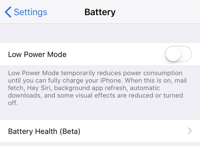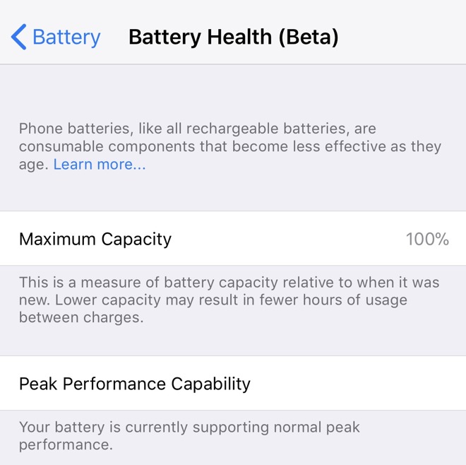 Battery Health (Beta) umožňuje uživateli zkontrolovat životnost a zbývající kapacitu baterie jeho přístroje, a také řídit jeho výkon. Tuto možnost Apple přidal na základě kauzy zpomalování svých zařízení po jejich aktualizaci na novější systém.