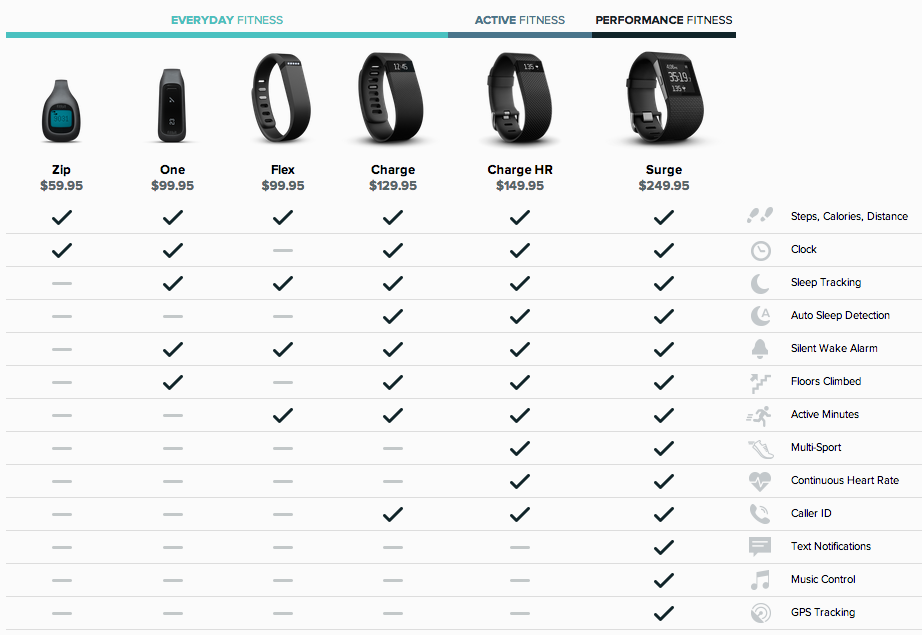 V jejich portfóliu se nachází na devět různých produktů. Nejlevnější a s nejméně funkcemi je Fitbit Zip, poté začínají funkce i cena nabývat s modely One, Flex, Charge, Charge HR a Surge. Kromě těchto náramků vyrábí značka Fitbit i Wi-Fi váhu, která dokáže odečítat tuk, což výborně doplňuje sportovní portfolio značky. V této nabídce najdete i Fitbit Ultra, který se již neprodává a byl to jeden z prvních produktů společnosti.