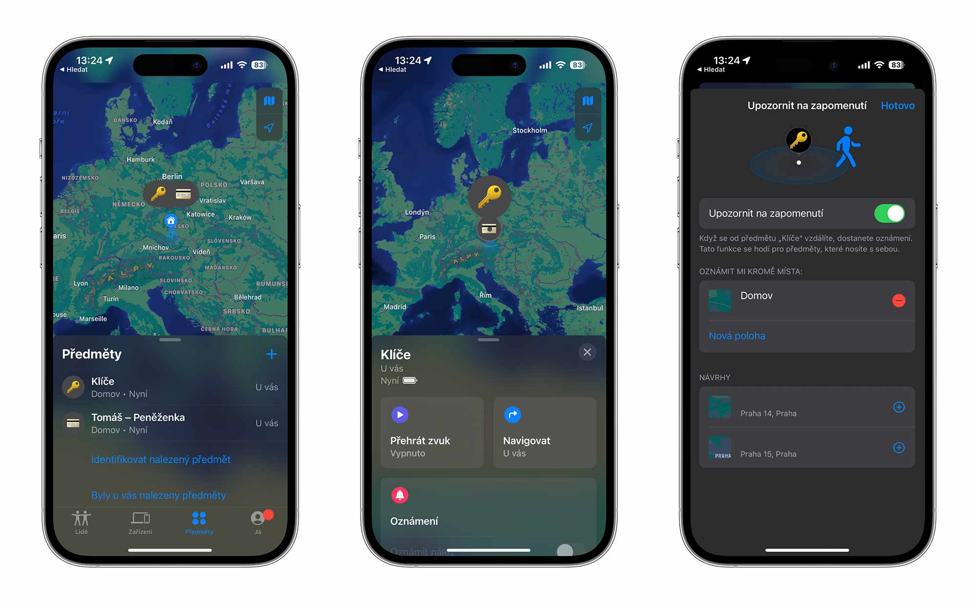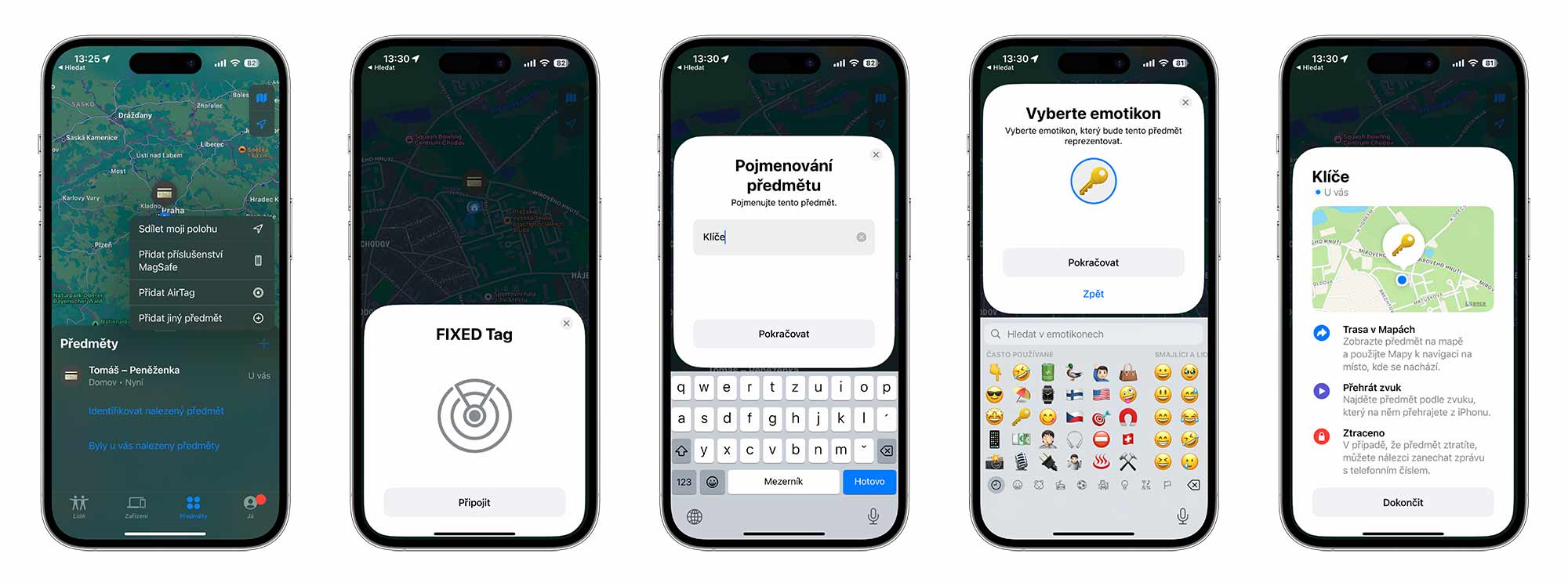 Teď už jen vyplníte jeho název a můžete přidat emoji. Já ho dal na klíče, takže dostal i odpovídající jméno a ikonu. Po přidání se zobrazuje v aplikaci Najít a vidíte jeho přesnou polohu. Můžete vynutit přehrání zvuku, přepnout se rovnou do navigace k němu nebo se nechat upozornit na jeho zapomenutí. Co neumí jako AirTag, je blízké hledání. To dokáže zjistit s přesností na desítky centimetrů, kde se tracker nachází a jakým směrem se k němu máte vydat. Občas se to hodí a několikrát jsem už to použil, ale dá se fungovat i bez toho. Pokud Tag zapadne za gauč, spustíte na něm zvuk a najdete ho stejně rychle.