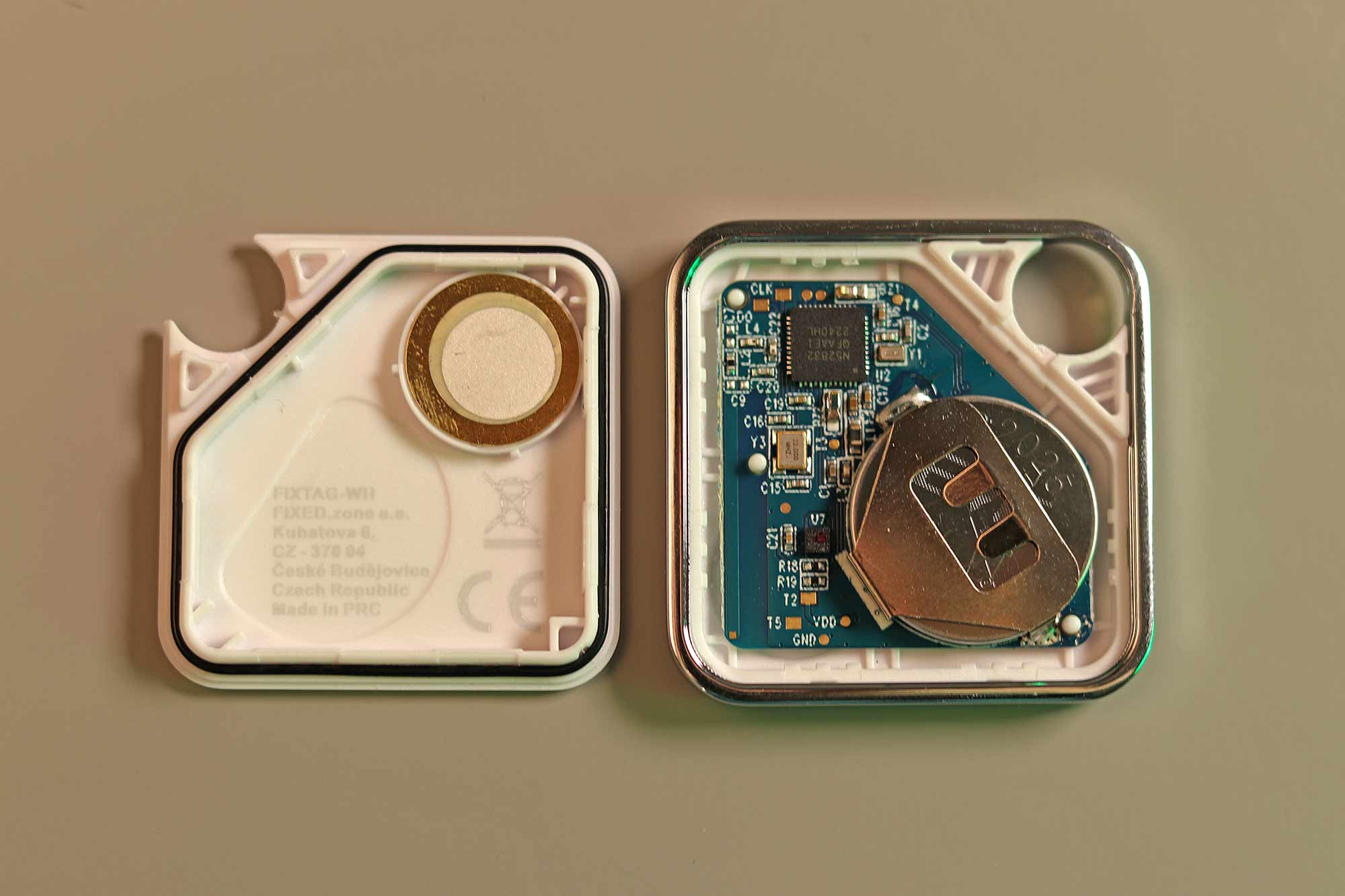 Kovový rámeček drží vše pohromadě a zdá se dost bytelný. Vnitřek je pak plast, který by sám o sobě po čase určitě doznal nějakého poškození. Výhodou ale je, že se snadno takto dostanete dovnitř, kde je uložená baterka. Rozměry Tagu jsou o něco větší než u AirTagu, ale FIXED trumfuje v použitelnosti celého designu.
