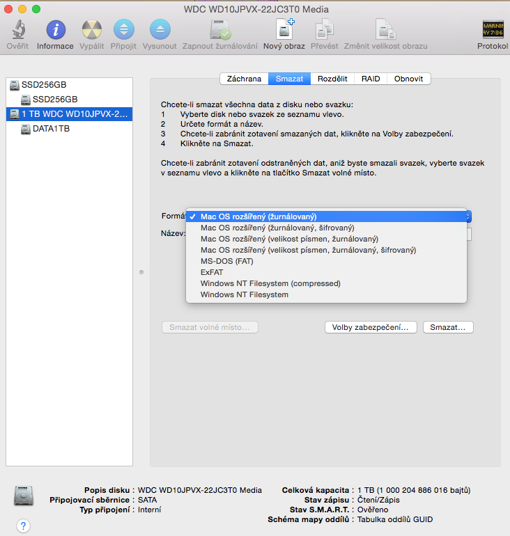 Každý nový uživatel OS X, který přešel z Windows, narazil určitě na problém s formátem souborů na disku. Jde o to, že každý systém má svůj vlastní formát a není příliš přátelský s ostatními systémy. Pokud si na MACu spustíte diskovou utilitu, lze zde provádět různé věci s diskem, včetně jeho smazání a naformátování. Formátů je na výběr opravdu mnoho a tak to projdu pěkně postupně.