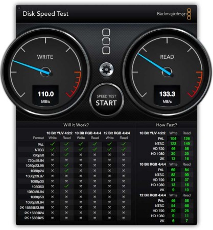 Díky USB 3.0 připojení a 7 200 otáčkám za minutu je disk velmi rychlý. Ze zvědavosti jsem vyzkoušel benchmark Blackmagic Disk Speed Test. Zápis se pohybuje okolo 105–115 MB/s a čtení mezi 125–135 MB/s. V praxi se 2GB soubor přesouvá v průměru necelou minutu. Pro srovnání jsem udělal stejný benchmark na svém pět let starém 1TB externím disku Western Digital. Rozdíl v zápisu a čtení je skoro 100 MB/s. Takový rozdíl je způsoben hlavně pomalejšími otáčkami, stářím a připojením pouze USB 2.0.