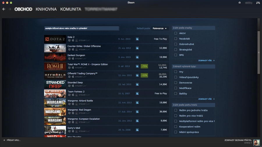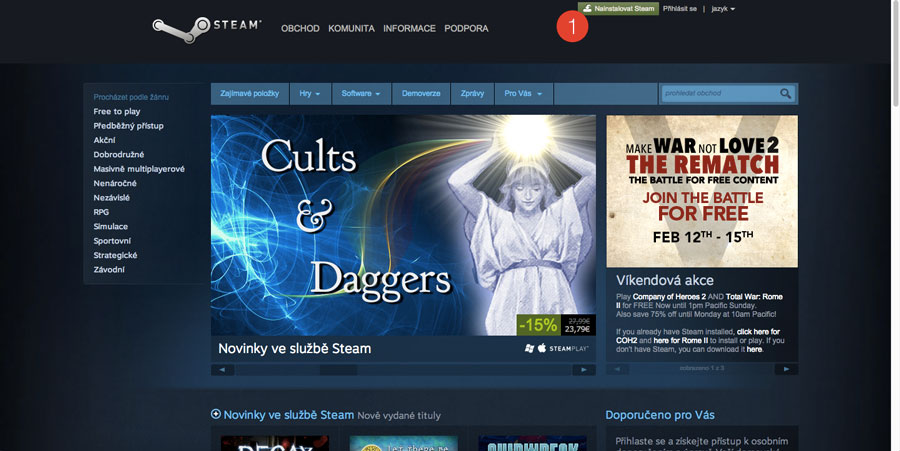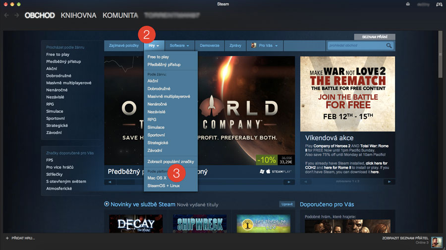 Největší portfolio her nabízí Steam. Netýká se to pouze placených, ale i free-to-play a demo her. Po stažení (1) a zaregistrování/přihlášení se objeví domovská stránka kde naleznete zajímavé položky a hlavně lákadla na slevy. V kategorii hry (2) poté naleznete rozdělení podle žánrů, včetně her na Mac OS X (3).