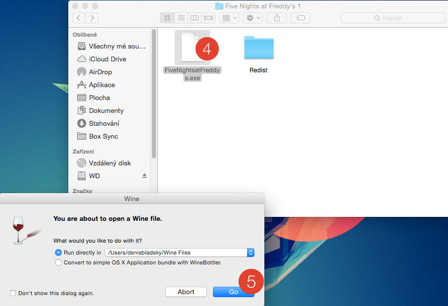 Poslední možnost je stáhnout si program WineBottler. Díky němu můžete spouštět programy s windowsáckou příponou .exe. Po nainstalování nechte běžet program na pozadí. Pokud budete chtít spustit nějaký exe program stačí na něj dvakrát poklepat (4) a poté dát Go (5). Program vše zpracuje a naskočí vám okno s programem nebo hrou. V mém případě jsem to zkoušel na Five Nights at Freddy’s a hra běžela bez sebemenších problémů.