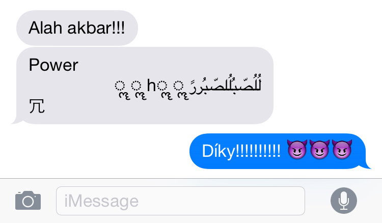 Zaslání řady arabských znaků na iPhone s iOS ve verzi 8.3 způsobuje restart celého zařízení z důvodu chyby v znakové sadě Unicode. Pokud byla aplikace iMessages při přijetí zprávy otevřená v pozadí, zařízení se restartuje pokaždé, když aplikaci iMessages spustíte. Přesně takový průběh postihl nemalý počet uživatelů ihned po tom, co se zpráva o chybě masivně zmedializovala a několik škodolibých jedinců začalo uživatele s aktivními iMessages zahlcovat spamem.