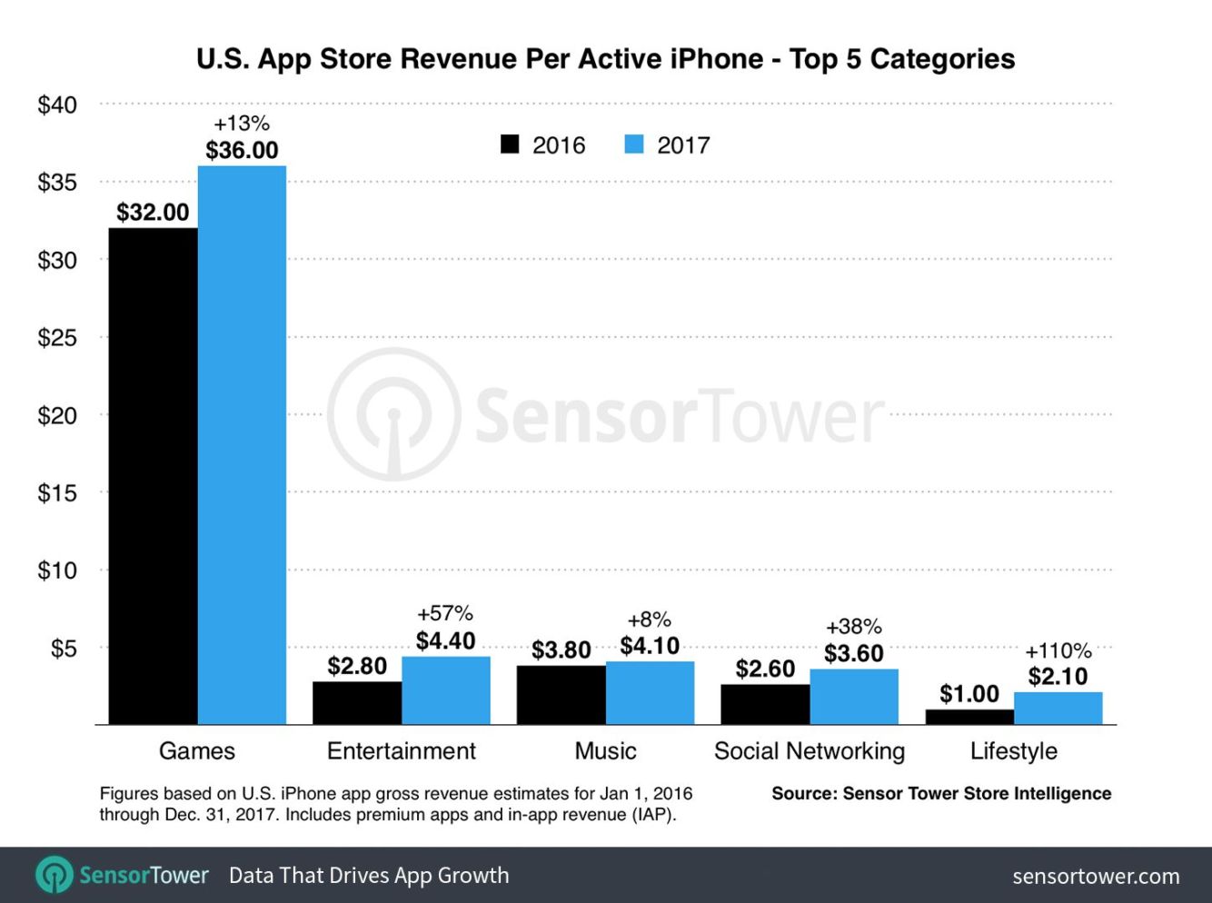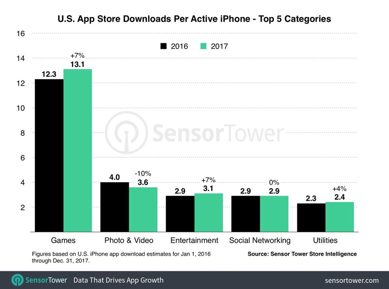 Ruku v ruce s nárůstem utracených peněz uvnitř aplikací roste i jejich počet, který si každý uživatel do svého iPhonu z App Store nainstaluje. Zde došlo k desetiprocentnímu nárůstu, což znaměná, že každý uživatel si nainstaloval o čtyři aplikace více, než tomu bylo v předchozímu roce. Za rok 2017 si tedy každý uživatel iPhonu nainstaloval 45 titulů. Největší růst zaznamenaly hry, kupodivu nastal pokles v žánru Foto a video.