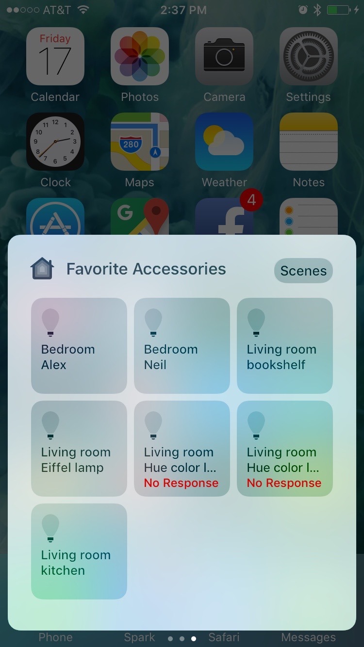 Třetí karta teď nově nabízí pohled na ovládání domácnosti pomocí platformy HomeKit. Objeví se vám pouze v případě, že máte nějaké zařízení s podporou HomeKitu nastavené v aplikaci Home. Na kartě jsou dva pohledy, jeden je na veškerá zařízení a druhý na přednastavené scény. Při výběru zařízení se rovnou objeví v ovládacím centrum prvky, které můžete měnit. Po výběru scény se rovnou aplikuje.