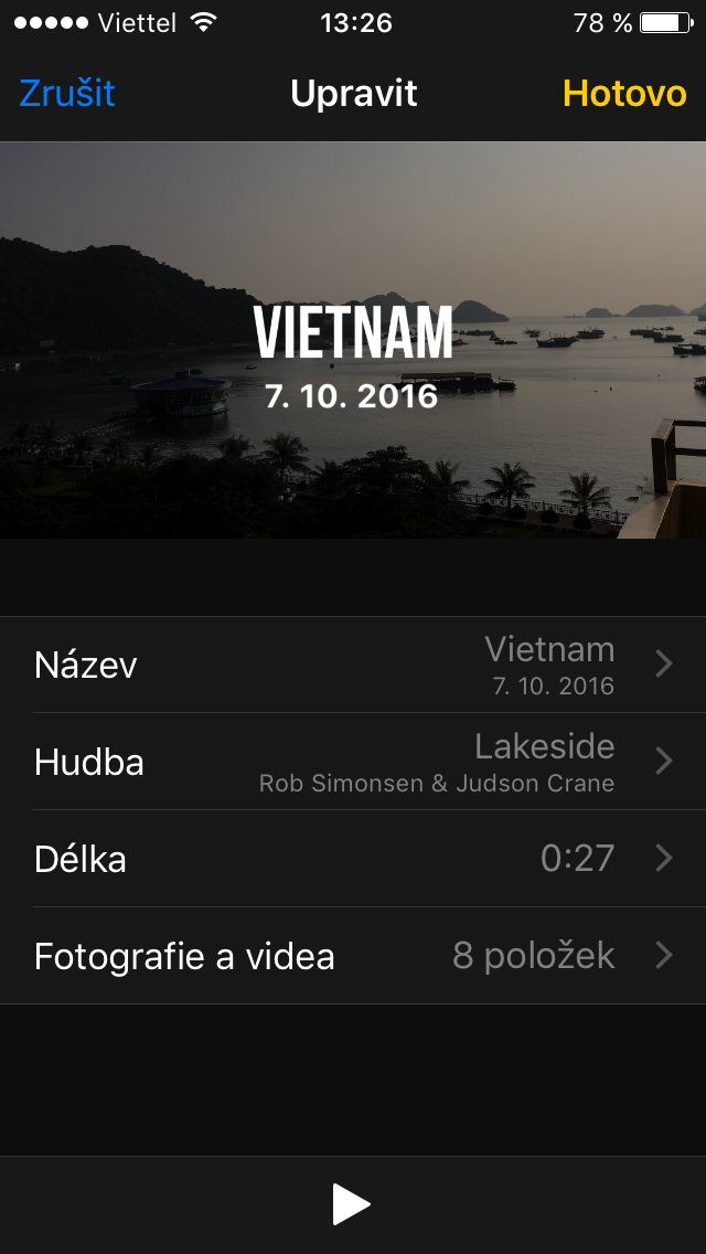 Bez jakékoli námahy pak můžete kliknout na Přehrát (malý trojúhelník), a aplikace udělá vše za vás. Přidá hudbu i jednotlivé fotky (nebo krátká videa) a prezentace je na světě.