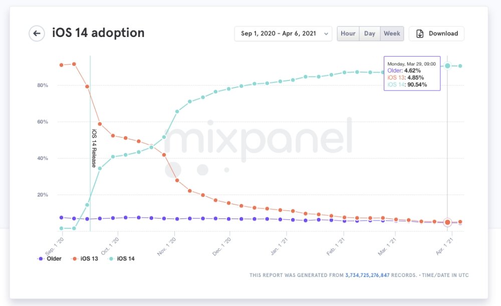 Aktualizace pro iOS mají vždy tendenci k rychlému přijetí mezi uživateli kvůli jejich snadné instalaci a počtu starších modelů iPhone, které podporují. Nejnovější iOS 14 se během šesti týdnů od spuštění dostal na odhadovanou 50% míru přijetí a nyní Mixpanel tvrdí, že překročil 90 %.