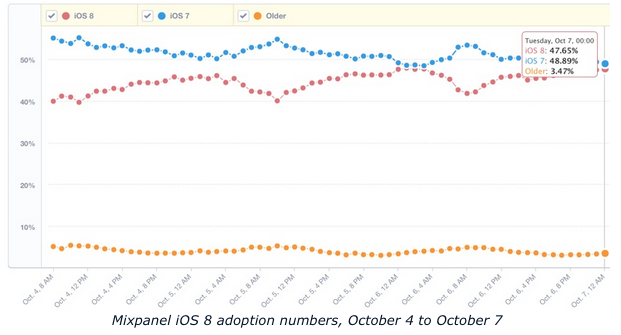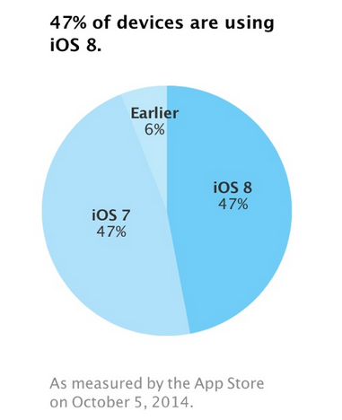 Skoro po třech týdnech je iOS 8 jen na 47 % zařízení, to je o dost méně než při příchodu iOS 7. Že by iOS 8 nebylo tak revoluční nebo má nějaké chyby? V současné době má iOS 8 nainstalováno 47 % lidí, 46 % stále využívá iOS 7 a 6 % jsou předchozí systémy. V minulém roce mělo iOS 7 touto dobou na svých zařízení již 70 % uživatelů. Měření se vztahuje k 5. říjnu a Apple to měřil dle přístupu do App Storu. Nedávno se v souvislosti s iOS 8 ukázalo několik chyb, které tento systém poznamenaly, a tak nemá u uživatelů takovou důvěru. Ti pravděpodobně čekají, až se odladí první mouchy. Hned první aférou byla bezpečnostní díra v aplikacích s HealthKitem, ty byly z App Storu dočasně odstraněny až do vydání updatu iOS 8. Ten přišel velmi rychle ve verzi iOS 8.0.1 a byl venku jen krátkou chvíli, než ho Apple sám stáhl zpět. Update způsoboval nefunkčnost telefonní sítě a Touch ID na iPhonu 6 a 6 Plus. Krátce na to vyšlo iOS 8.0.2, které opravovalo všechny výše zmíněné problémy plus další chyby. Méně diskutované chyby se objevily ve spojení s iCloudem při obnovení výchozích nastavení, což mazalo všechny dokumenty, a dále si několik uživatelů stěžovalo na Bluetooth, pomalou Wi-Fi a rychlé vybíjení baterie. V současné době Apple pracuje na iOS 8.1, 8.2 a 8.3. Verzi 8.1 mají již vývojáři k dispozici a mohou ji testovat. Měla by opravovat výše zmíněné chyby, a navíc bude podporovat Apple Pay, která se v říjnu očekává. Zdroj: MacRumors