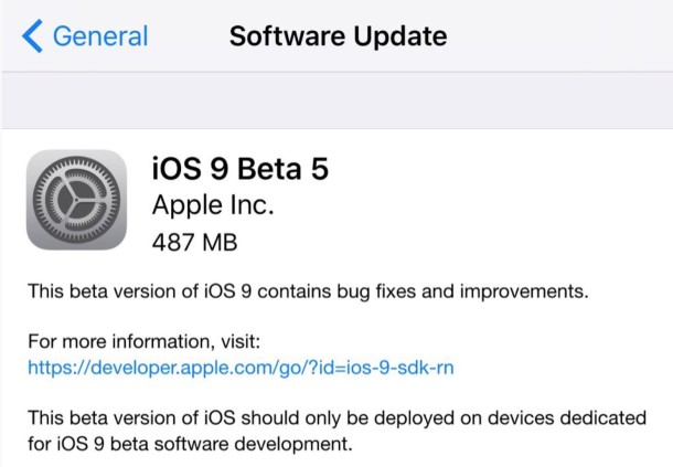 iOS 9 Beta 5 nese označení 13A4325c a lze ji stáhnout přímo v iOS zařízeních nebo skrze Apple Devoleper centrum. Apple tuto poslední beta verzi uvolnil i pro veřejné testování, takže si ji mohou stáhnout všichni uživatelé, kteří jsou přihlášeni do testovacího programu.
