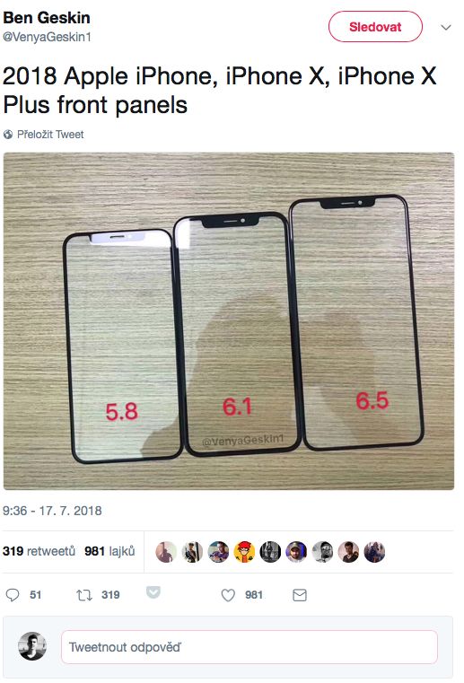 Aktuální model X má úhlopříčku 5,8 palce. To je podle Applu zřejmě málo, takže si pro nás chystá další dva modely, které budou větší a aktuální iPhone X je tak ze všech tří telefonů nejmenší a nejkompaktnější. Další dva modely by totiž měly mít displej o úhlopříčce 6,1 a 6,5 palců.