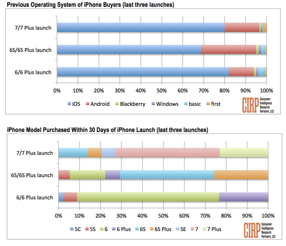Zpráva z výzkumu firmy Consumer Inteligence Research Partners odhaluje detaily prodejnosti nejnovějšího iPhonu 7. Potvrzuje se tak větší podíl uživatelů, kteří přecházejí z Androidu. Také je vidět větší počet zákazníků oproti loňskému modelu iPhonu 6s.